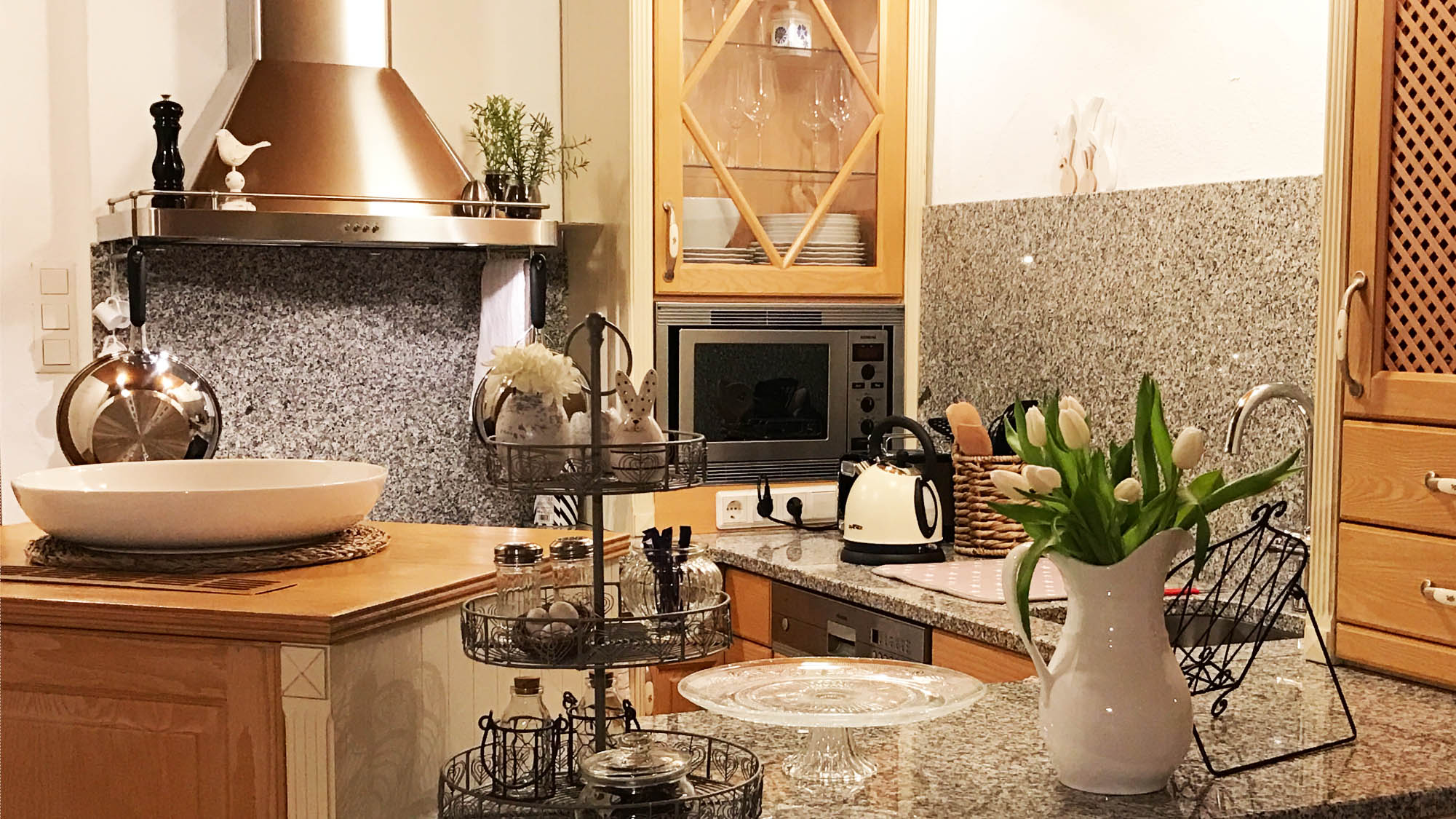 Wasserkocher, Filterkaffeemaschine, Eierkocher, Toaster, Handrührgerät, Mixstab, Mikrowelle, Geschirrspühlmaschine (mit Tabs), Gefrierschrank, Geschirrtücher